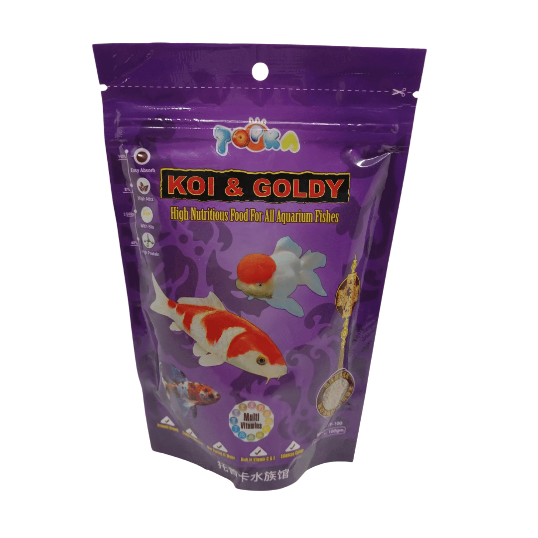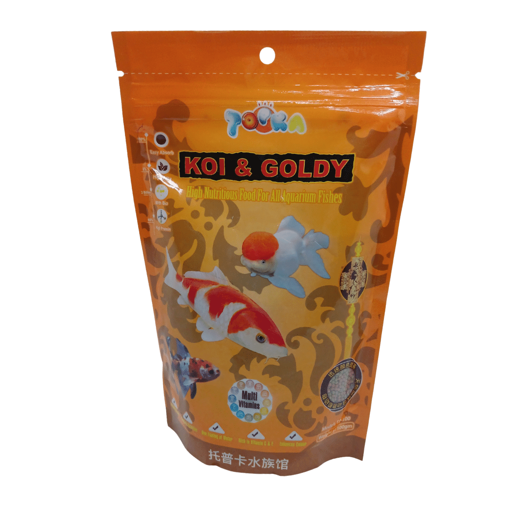 Koi & Goldy Fish Food (100g) is a specially formulated, high-quality floating pellet designed to meet the dietary needs of Koi and Goldfish. Enriched with essential vitamins, minerals, and proteins, it supports healthy growth, vibrant colors, and overall immunity. The floating pellets help reduce water pollution and allow easy monitoring of your fish’s feeding habits, making it an ideal daily diet for your pond or aquarium fish.