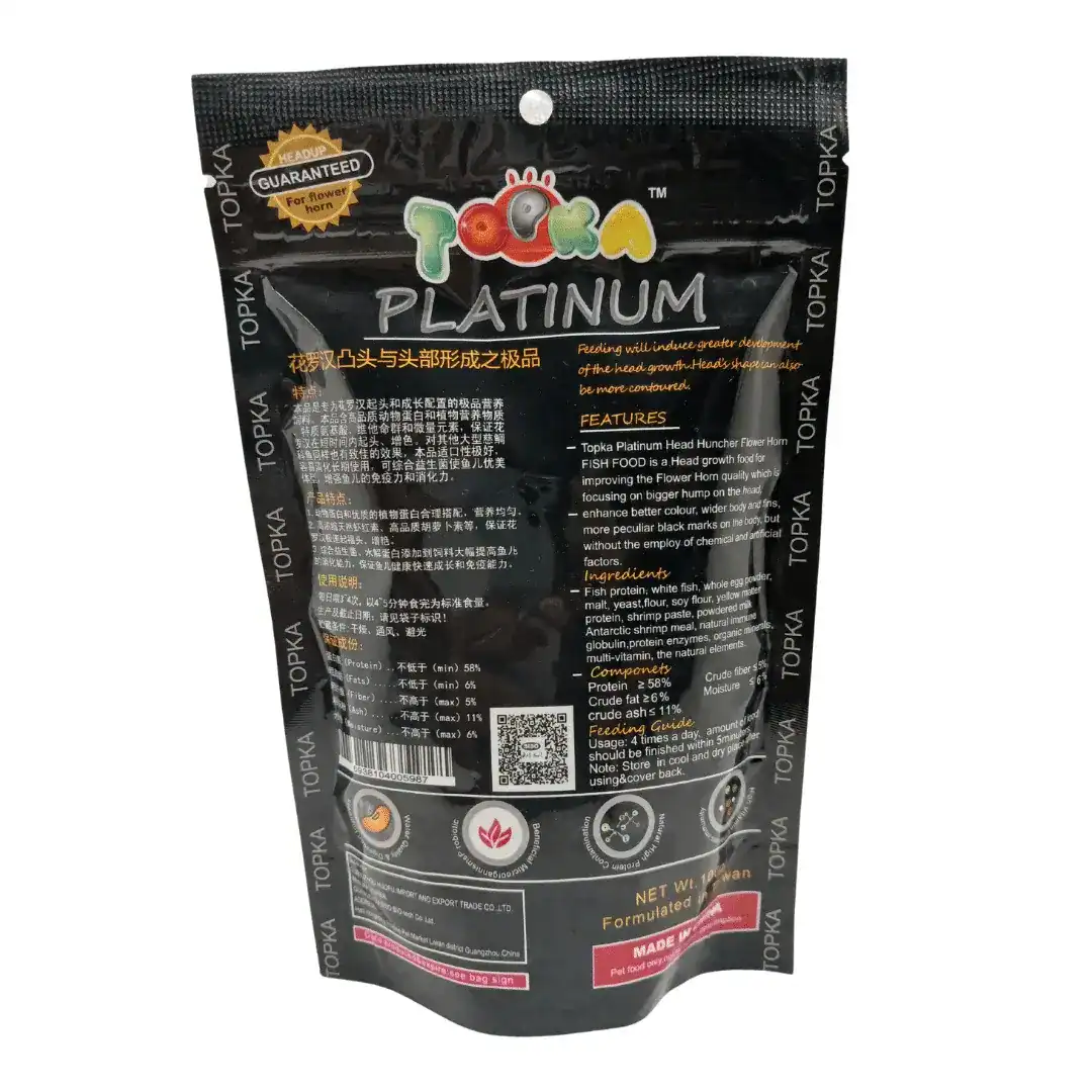 Topka platinum head huncher, colour faster it is a unique formulated fish feed to induce speedy head growth. Shape of head will improve significantly through constant feeding. It has a high content of spirulina and krill extracts and other colour enhancing elements that will enhance the fishes sparkle dots in 1- 2 weeks. Special immune substance added to increase fishes resistance against disease.